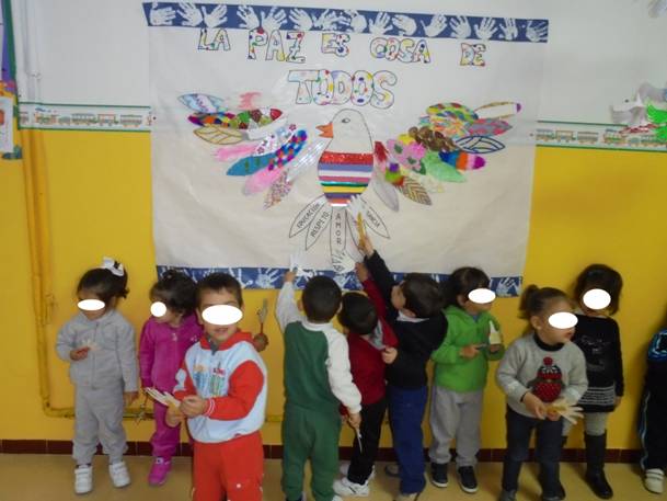 Nos centraremos en la realización de un mural con ayuda de toda la comunidad educativa porque la PAZ ES COSA DE TOD@S. Se confeccionará una gran paloma de la paz, donde cada pluma se llevará a casa y será el menor junto con su familia los encargados de decorarla libremente, para luego unirlas tod@s y con la idea de que nuestra gran paloma de la paz sea una paloma construida entre todos y todas y variada como es nuestro mundo en color, textura, ..para ello se dará la consigna de poder decorarse como se quiera y con los materiales que cada uno/a quiera utilizando cualquier forma plástica así como textos alusivos a la paz, poemas…