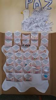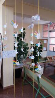 1º Las cintas de la paz colgadas del techo: donde exponemos nuestros compromisos para hacer de nuestro cole un lugar más tranquilo y apacible. Lo hemos escrito en las palomas de la paz de Picasso hechas con las siluetas de nuestras manos.