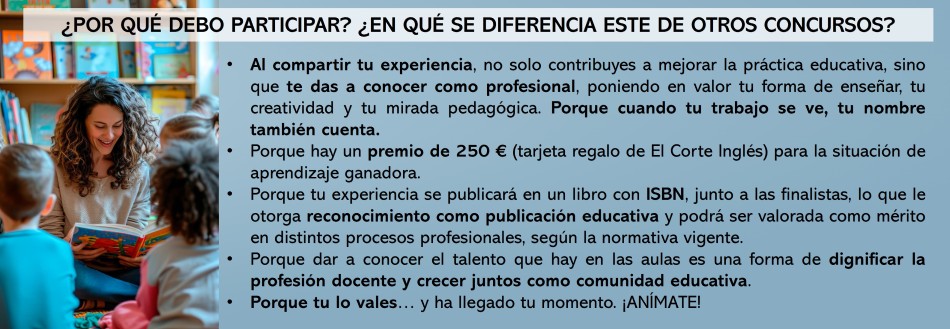Con el Concurso de Situaciones de Aprendizaje Basadas en Cuentos, queremos reconocer y poner en valor la labor de los y las docentes de Educación Infantil que, día a día, transforman los cuentos en experiencias educativas llenas de sentido. Este concurso nace con el propósito de recopilar, compartir y difundir propuestas didácticas de calidad, creadas desde la práctica real del aula, que sirvan de inspiración y apoyo a otros profesionales de la etapa.